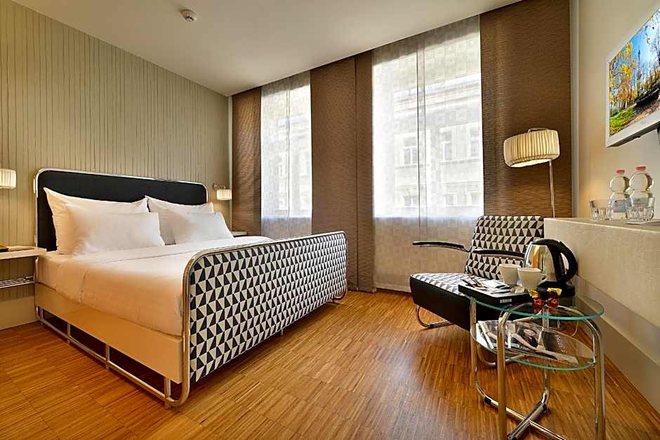 These rooms feature heated bathroom floors, soundproof windows, and free Wi-Fi. The elegant design is inspired by pre-war Prague architecture.